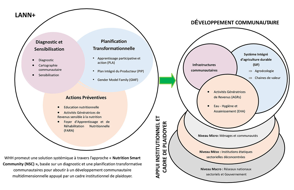 WHH met en œuvre le programme Nutrition Smart Community (NSC) à travers une approche intégrée et progressive visant à renforcer durablement la sécurité alimentaire, nutritionnelle et la résilience des communautés. L’intervention commence par des diagnostics participatifs, des cartographies communautaires et des actions de sensibilisation, permettant d’identifier les vulnérabilités et les besoins tout en favorisant l’appropriation locale. Sur cette base, WHH déploie une planification transformationnelle incluant l’apprentissage participatif (PLA), les Plans Intégrés du Producteur (PIP) et le modèle « Gender Model Family (GMF) », intégrant de manière transversale le genre, la gouvernance familiale et la durabilité dans les stratégies de nutrition et de moyens de subsistance.